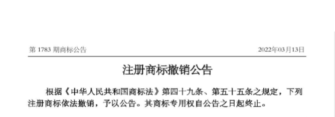 而上述第54****号商标注册日期是1991年4月10日,后期进行了续展,专用期限截止到2031年4月9日,但是被他人以“连续三年不使用”为由提出了撤销,在2022年3月13日商标局正式公告撤销情况.