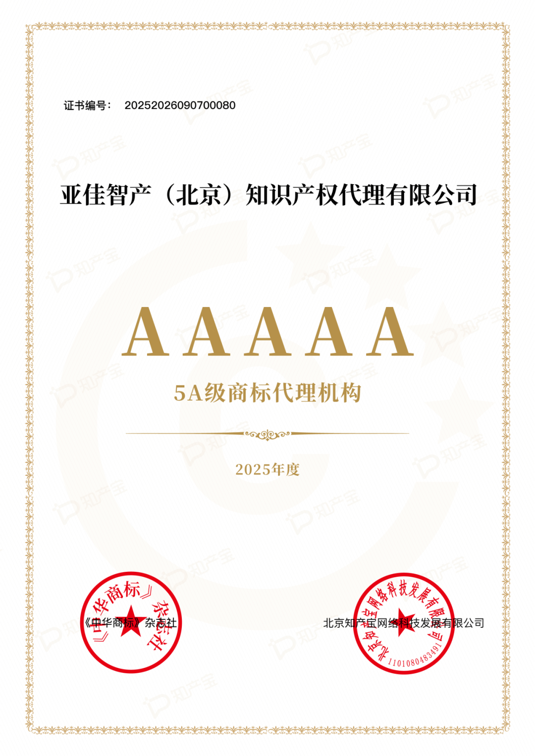继八月荣登“2025年度北京商标代理机构TOP300”权威榜单后,亚佳知识产权再传捷报!《中华商标》杂志社联合知产宝发布的“2025商标代理服务能力数据统计600”显示,亚佳知识产权凭借卓越的综合实力与服务品质,成功斩获最高荣誉——“5A级商标代理机构”称号!