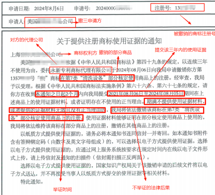 内容:通知注册人其某商标被他人申请撤销,要求其在收到通知之日起2个月内提交该商标在指定三年期间(通常是申请撤销之日向前推算三年)在核定使用商品/服务上的使用证据,或说明不使用的正当理由。
